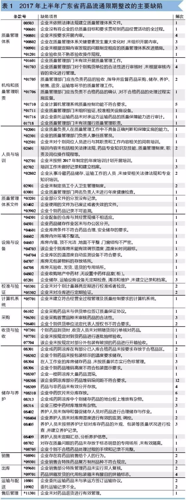 为方便大家迎接检查,笔者对2017年上半年广东省食品药品监督管理局通告(撤销19家,限期整改37家)的检查缺陷汇总分析,发现被责令限期整改的企业存在的主要问题具体如表1。
