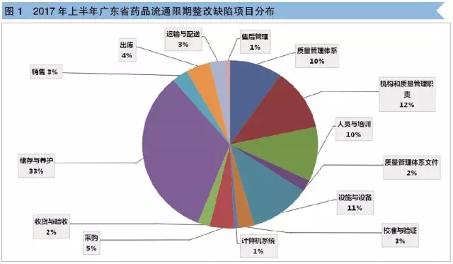 图1可看出,储存与养护出现的缺陷项目最多,占33%;接着分别是机构和质量管理职责(占12%)、设施与设备(占11%)、人员与培训(占10%)、质量管理体系(10%);最后依次是采购(5%)、出库(4%)、销售(3%)、运输与配送(3%)、收货与验收(2%)、计算机系统(1%)。