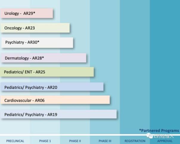 另外Arbor还拥有用于泌尿科、肿瘤科、神经科、皮肤科、小儿耳鼻喉科、心血管科等治疗领域的8个在研产品,均处于临床试验阶段,其中小儿科、神经科用药AR19接近临床Ⅲ期试验尾声。