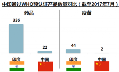 在已经通过WHO预认证产品数量上,中印两国仍然存有差距。印度通过WHO预认证的药品数量为336个,中国只有22个,印度通过WHO预认证的疫苗数量有44个,中国仅为2个。