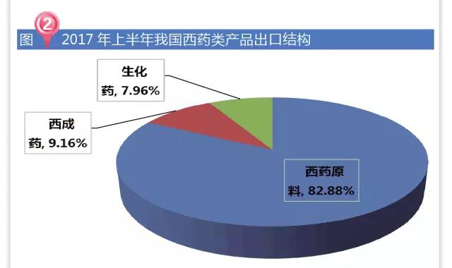 2017年上半年,我国西药类产品三大类别的出口格局保持稳定。原料药出口占比高达82.88%,有所上升;而西药制剂和生化药的出口占比分别小幅下降至9.16%和7.96%。