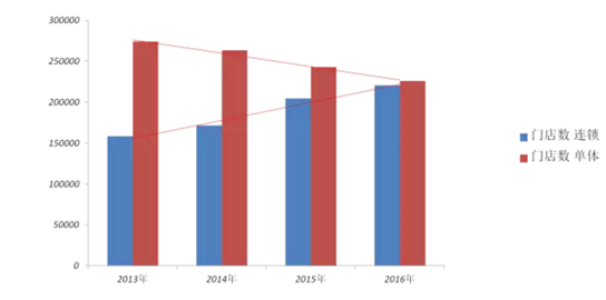 而相比于2015年2016年药店数居然下降了1000多家。同时,在大连锁的并购潮中,2016年连锁药店门店数也赶超单体药店。