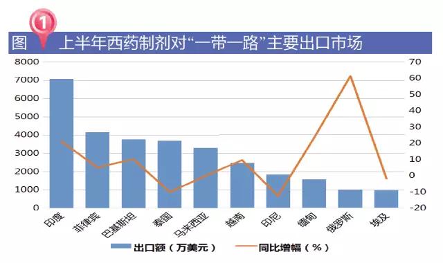 今年上半年,我国对中东欧地区、中亚和非洲等“一带一路”沿线国家制剂出口增势迅猛,增幅分别达到34.9%、27.8%和3.4%。印度、菲律宾、巴基斯坦、越南、缅甸、俄罗斯和波兰是拉动我国西药制剂对“一带一路”国家出口增幅的主要力量,也是我国制剂出口的重点市场。其中,我国对印度、缅甸、俄罗斯、孟加拉等均实现20%以上的增长,对印度出口额超过7000万美元,对菲律宾、巴基斯坦、泰国和马来西亚的出口都在3000万美元以上,是我国制剂对“一带一路”出口的前五大市场。