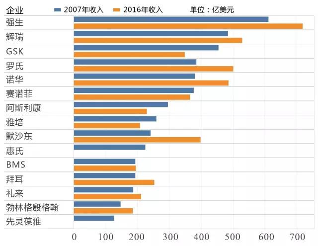 图1 制药巨头收入对比:2007 VS. 2016