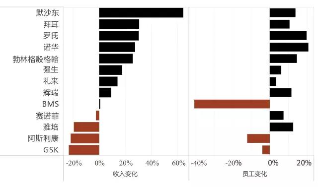 图2 2007 VS. 2016 制药巨头收入与员工变化