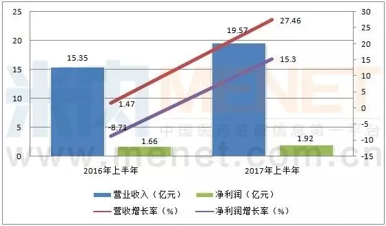 2017年上半年,葵花药业的业绩较上年增长较为迅速。实现营业收入19.57亿元,比上年同期增长27.46%;归属于上市公司股东的净利润1.92亿元,比上年同期增长15.30%。