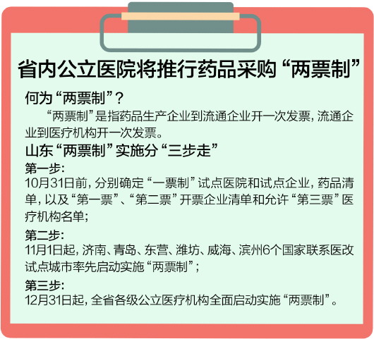 2016年12月,国务院医改办等八部委联合出台了《关于在公立医疗机构药品采购中推行“两票制”的实施意见(试行)》,之后国家卫生计生委制定了实施方案,要求综合医改试点省(区、市)和公立医院改革试点城市率先推行“两票制”,鼓励其他地区执行“两票制”,争取到2018年在全国全面推开。今年5月,山东省召开全省卫生与健康大会,会上对实施“两票制”,鼓励实行“一票制”提出了明确要求。山东省卫计委会同相关部门,研究起草了《实施方案》征求意见稿,使这项改革措施最大程度地形成了共识。