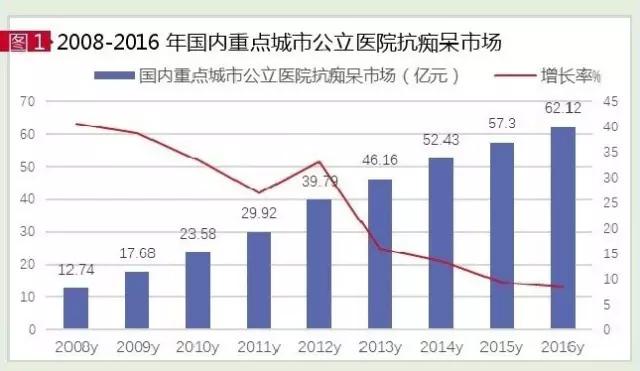 卡巴拉汀又名利斯的明,是FDA批准的用于治疗老年性痴呆的一种假性不可逆性乙酰胆碱酯酶抑制剂,属氨基甲酸酯类化合物,和毒扁豆碱同类。诺华公司的卡巴拉汀是国内上市的独家品种,商品名为艾斯能(Exelon)。2016年,Exelon全球销售额为4.44亿美元。2016年国内城市样本医院艾斯能销售额为3126万元,同比上一年增长22.25%,2012-2016年年平均增长率高达35.50%。