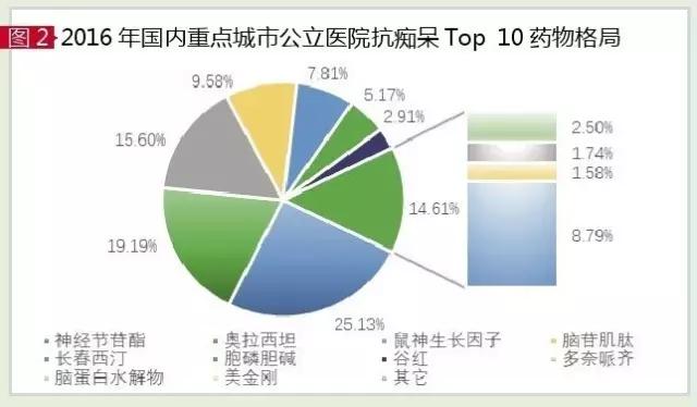 据 CFDA南方医药经济研究所HDM系统数据,2016年国内重点城市公立医院抗老年性痴呆化药市场为62.12亿元,同比上一年增长8.41%。临床具有治疗和改善老年性痴呆症的药物有近30个品种,TOP 10药物是单唾液酸神经节苷酯、奥拉西坦、鼠神经生长因子、脑苷肌肽、长春西汀、胞磷胆碱、谷红注射液、多奈哌齐、脑蛋白水解物和美金刚。在中国脑血管病引起的痴呆占比影响下,促智辅助治疗药物占据了80%以上的份额。从医院和零售市场两大渠道来看,医院是抗痴呆药物终端市场的主体,占据了85%以上的比重,国内总体市场规模已超过300亿元。