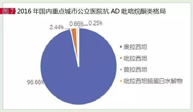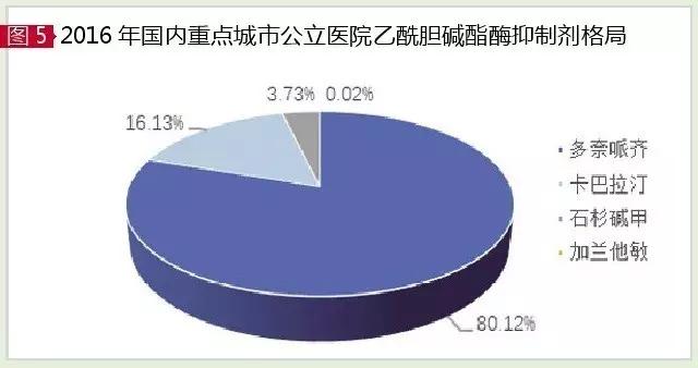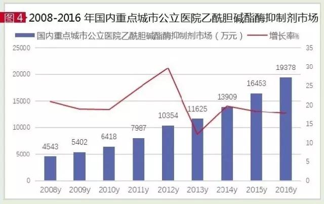 目前获得美国FDA批准用于治疗AD的乙酰胆碱酯酶(AChE)抑制剂有多奈哌齐、卡巴拉汀、加兰他敏和他克林。据HDM系统数据,2016年国内城市样本医院AChE抑制剂市场为1.94亿元,同比上一年增长17.78%。其中,多奈哌齐、卡巴拉汀和石杉碱甲占据99.98%的份额,加兰他敏份额极小,他克林已淡出临床。