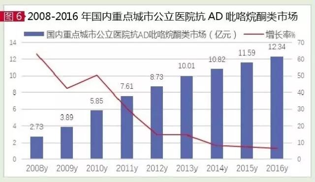 奥拉西坦与吡拉西坦、茴拉西坦是目前临床上常用的三种脑代谢改善药,为吡咯烷酮类衍生物,这类药物于20世纪90年代在中国上市。据HDM系统数据,2016年国内城市样本医院抗AD吡咯烷酮类市场为12.34亿元,同比上一年增长6.43%。