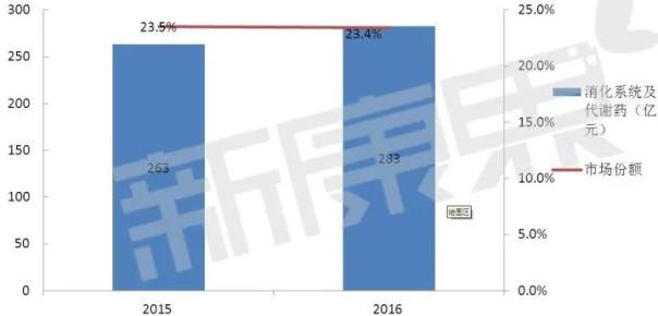 2016年度消化系统及代谢药化学药市场总体规模为283亿元,是零售药店化学药市场中的最大品类,同比增长7.4%;市场比重同比下滑 0.1个百分点,为23.4%。