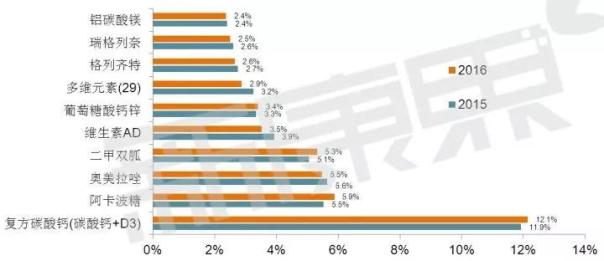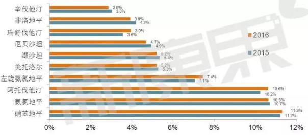 在2016年心血管系统药物化学药市场中,TOP10合计份额为65.8%。钙通道阻滞剂硝苯地平和氨氯地平势力相当,占比都在10%以上,地平市场表现更胜一筹,同比份额略显提升;top10中,钙通道阻滞剂品种还包括左旋氨氯地平和非洛地平。阿托伐他汀是降血脂药中的首要品种,本期份额为10.6%,同比提升0.4个百分点。