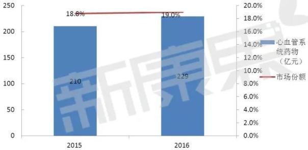 2016年度心血管系统药物化学药市场总体规模为229亿元,是零售药店化学药市场中的第二大品类,较15年度呈9.1%的良好增长,市场份额同比也有0.2个百分点的提升。