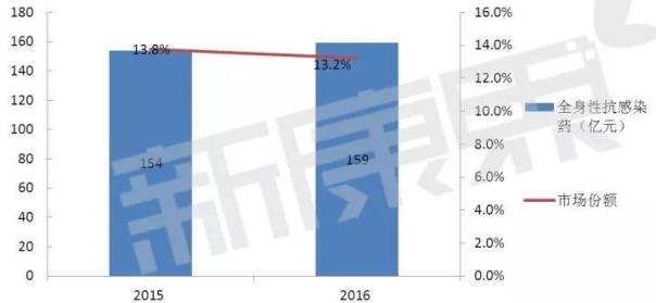 据中康CMH监测数据显示,2016年度零售药店全身性抗感染药化学药市场规模为159亿元,呈3.5%增长;市场份额却出现0.3个点的下降。
