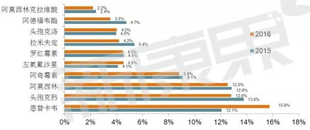 在2016年全身性抗感染药化学药市场中,全身性抗细菌药占比68%,全身性抗病毒药占比28%,其余为全身性抗真菌药和抗分枝杆菌药。Top10品种合计份额为72.8%,市场集中度较高。全身性抗病毒药恩替卡韦以15.8%的占比排名首位。恩替卡韦为鸟嘌呤核苷类似物,对乙肝病毒(HBV)多聚酶具有抑制作用。目前主要用于乙肝抗病毒治疗,具有起效快,抵制乙肝病毒强,低耐药的特点,是慢性乙肝患者抗病毒治疗的首选。紧随恩替卡韦之后的是全身性抗细菌药头孢克肟和阿莫西林,市场比重均在12%以上,份额同比均有下滑。