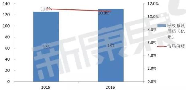 在呼吸系统用药化学药市场,2016年度市场总规模为131亿元,同比呈4.2%的增长,市场份额从15年的11.2%下降到10.8%。