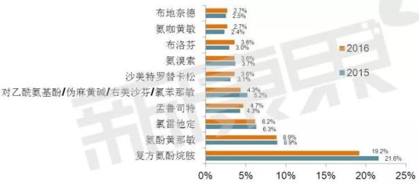 据中康CMH监测数据显示,在2016年呼吸系统用药化学药市场,咳嗽和感冒用药的占比最大,高达65.5%;其次是抗哮喘药和全身性过敏药,分别占有比重17.0%和10.0%。前十位品种中,咳嗽和感冒用药占据了6个席位,包括复方氨酚烷胺、氨酚黄那敏、对乙酰氨基酚/伪麻黄碱/右美沙芬/氯苯那敏、氨溴索、布洛芬和氨咖黄敏;仅布洛芬和氨咖黄敏份额同比有所提升。氯雷他定是全身性过敏药中的首要品种,本期份额为6.2%,同比丢失0.1个百分点。抗哮喘药孟鲁司特和沙美特罗替卡松也入围了top10品种,两者份额同比均有所提升,市场表现不错。