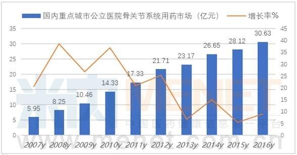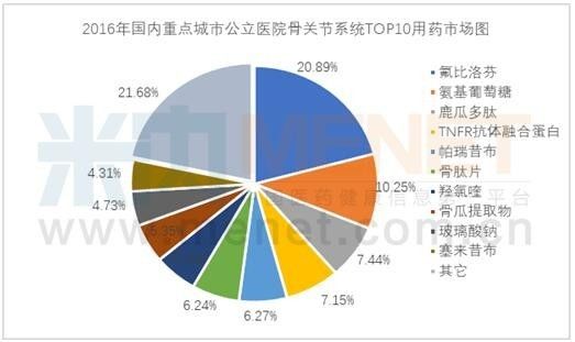 据米内网数据显示,2016年国内重点城市公立医院骨关节TOP10药物占据其总体市场的78.26%。具体品种是氟比洛芬酯、氨基葡萄糖、鹿瓜多肽、重组人Ⅱ型肿瘤坏死因子受体-抗体融合蛋白、帕瑞昔布、骨肽、羟氯喹、骨瓜提取物、玻璃酸钠和塞来昔布。