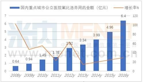 据米内网数据显示,2016年国内重点城市公立医院氟比洛芬用药金额6.40亿元,同比上一年增长了28.88%。北京泰德制药的氟比洛芬酯注射液“凯纷”占据了83.59%,氟比洛芬巴布膏“泽普思”占据了16.41%,国内氟比洛芬总体市场已超过40亿的规模。