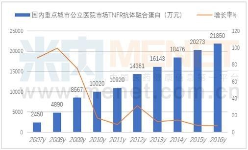 据米内网数据显示,2016年国内重点城市公立医院TNFR抗体融合蛋白市场为2.19亿元,同比上一年增长了7.78%。统计数据显示,国内重组人Ⅱ型肿瘤坏死因子受体-抗体融合蛋临床用药已达到了16.80亿元的市场规模。三生国健药业(上海)的益赛普占据了TNF-α拮抗剂市场的60%。2017版《国家医保药品目录》收载了重组人Ⅱ型肿瘤坏死因子受体-抗体融合蛋白,对未来市场的放量具有重要意义。