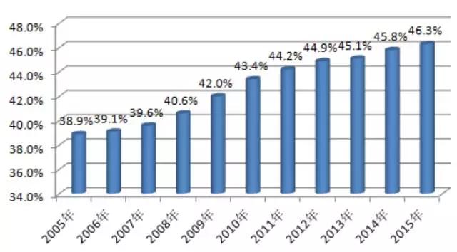 在2005年为38.9%,至2008年突破40%达到40.6%,至2011年提升至44.20%,2015年达到46.3%,2016年虽无公开资料披露,但笔者预计已然超过47%。