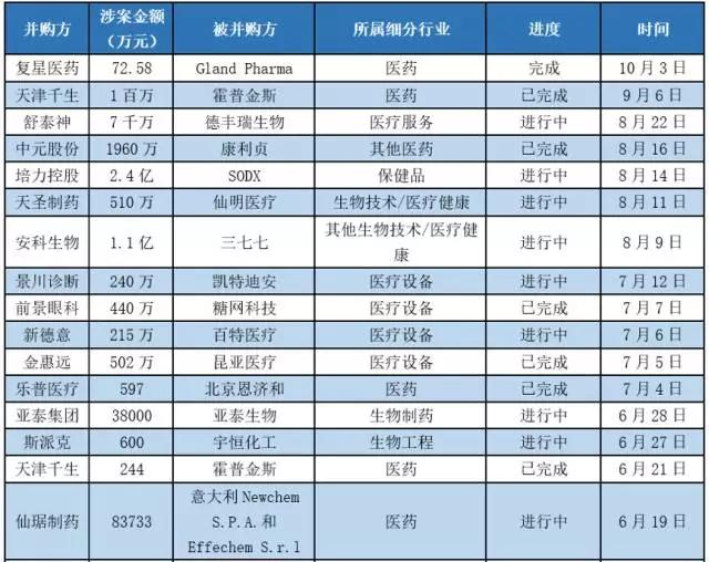 其中,代表性案例如复星医药72.45亿元收购Gland Pharma、仙琚制药逾8.37亿元收购两家意大利药企,北大医药近5亿收购卡南吉医药等几起。此外,国内也有数十项大大小小的医药行业并购案例处于各个阶段。