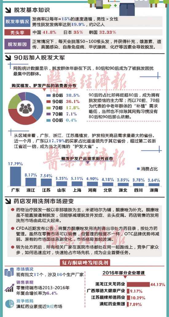 医药网10月25日讯 少年白发、青年脱发、中年谢顶…头发以它异于常态的表现,在发送亚健康的信号。“发际线保卫战”成为现代人们越来越早就开始打响的捍卫战。从专业护发门店、网购到药店,护发、育发、脱发类产品的市场不断壮大,零售终端也因该市场觉醒获得不少盈利。