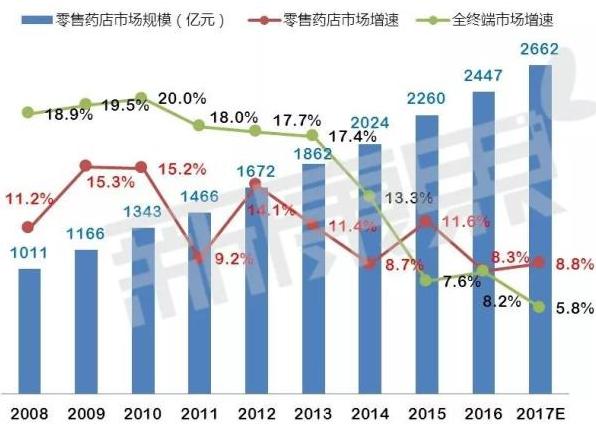 近十年,全国六大终端药品市场规模同比增速呈下滑态势,尤其是从2014年开始,增速下降的幅度有所加大,预计2017年增速仅有5.8%。而反观零售药店,从2015年开始药品市场规模的同比增速一直高于全终端,预计2017年零售药店药品增速将达到8.8%。