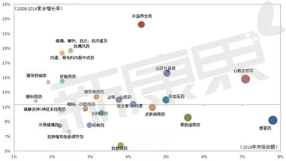 对比零售药店2008-2016年11.3%的总体CAGR(复合年均增长率),有12个药品品类的CAGR高于药店市场均值,其中增长最快的前5个品类是补益养生类,镇痛、解热、抗炎、抗风湿及抗痛风药,风湿、骨伤科内服中成药,泌尿补肾类,心脑血管类。