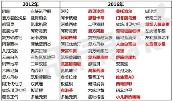 表1 2012年与2016年零售药店销售额超10亿元品种对比