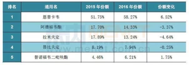 表1:2016年乙型肝炎抗病毒用药通用名销售情况
