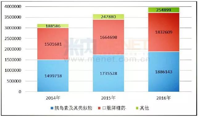 图1:2014-2016年中国公立医疗机构降糖化药市场规模(单位:万元 )