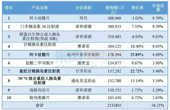 据米内网数据,2016年中国公立医疗机构,降糖化药品牌格局中排在首位的依然是拜耳的阿卡波糖片,销售额为38.9亿元,不过市场份额有所下滑,由2015年10.77%下滑至9.79%,该药物属于α-糖苷酶抑制剂类。而排在第二位的是诺和诺德的门冬胰岛素30注射液,近几年该药品销售一直处于快速增长阶段,2016年达到38.1亿元,同比增长7.35%,市场份额为9.59%,预计2017年有望超过阿卡波糖片,成为降糖药榜首。