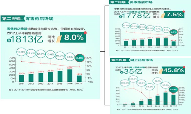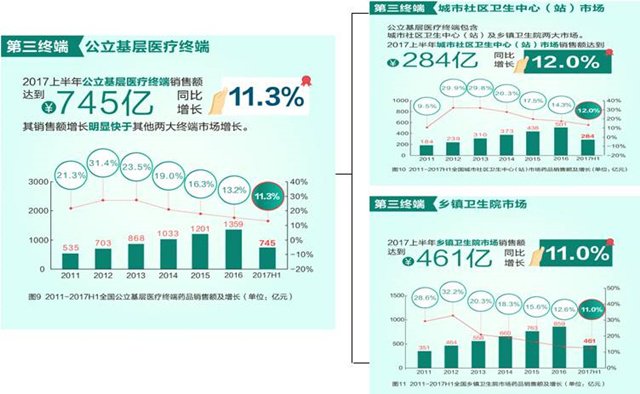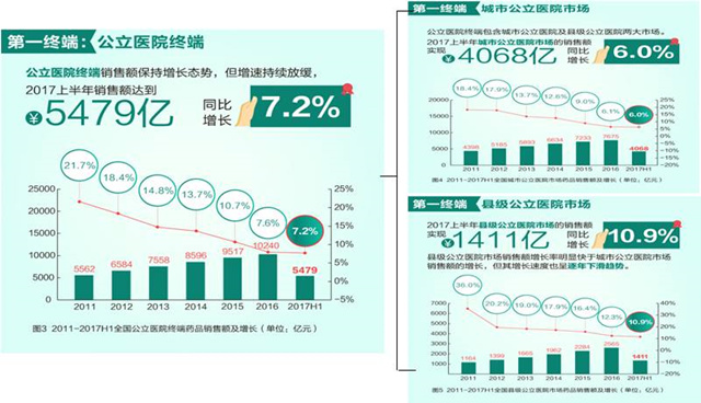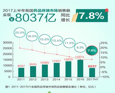 据米内网数据显示,2017年上半年我国药品终端市场销售额8037亿元,同比增长7.8%。从实现药品销售的三大终端销售分布来看,公立医院终端市场份额最大,达68.1%。全民医保政策在城市的实施、医保服务范围和支付比例的扩大、疾病谱的改变成为拉动医院市场增长的最主要动力。