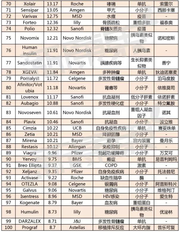 榜单中的新面孔有礼来的新型糖尿病药物Trulicity、辉瑞的自身免疫疾病用药Xeljanz、强生的多发性骨髓药物DARZALEX。此外,一些排名上升幅度较大的的药物有阿斯利康的Nexium、强生的前列腺癌药物Zytiga、默沙东的宫颈癌疫苗Gardasil、诺华的银屑病药物Cosentyx等。
