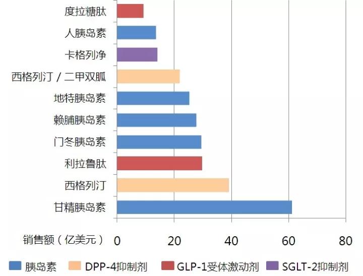 2016年全球Top 10糖尿病药物销售额总计271.4亿美元,占据该市场近一半的份额。具体品种分别是甘精胰岛素(销售额为61.1亿美元,下同)、门冬胰岛素(29.6亿美元)、赖脯胰岛素(27.7亿美元)、地特胰岛素(25.3亿美元)、人胰岛素(13.7亿美元)、西格列汀(39.1亿美元)、西格列汀/二甲双胍(22.0亿美元)、利拉鲁肽(29.7亿美元)、度拉糖肽(9.2亿美元),以及卡格列净(14.1亿美元)。