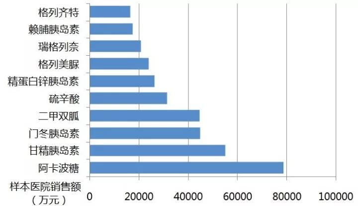 2016年,样本医院糖尿病前十品种总金额在该用药领域中占比64.2%。其中,口服血糖调节药5个,分别为阿卡波糖(样本医院销售额为7.9亿元,下同)、二甲双胍(4.5亿元)、格列美脲(2.4亿元)、瑞格列奈(2.1亿元)、格列齐特(1.6亿元); 胰岛素类4个,分别为甘精胰岛素(5.0亿元)、门冬胰岛素(4.5亿元)、精蛋白锌胰岛素(2.6亿元)、赖脯胰岛素(1.7亿元);糖尿病综合征用药1个,即硫辛酸(3.0亿元)。增长较快的有甘精胰岛素(同比增长10.4%,下同)、二甲双胍(14.8%)、赖脯胰岛素(10.5%)。