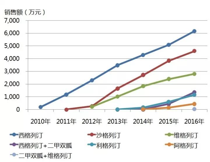 图5 2010-2016年DPP-4抑制剂样本医院市场销售趋势