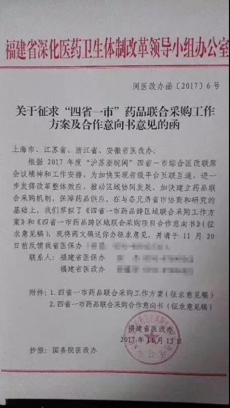 近日,业界流出一份落款为福建省医改办的红头文件,文件题为《关于征求“四省一市”药品联合采购方案及合作意向书意见的函》。联合采购方案由福建省医改办起草,送上海市、江苏省、浙江省、安徽省医改办征求意见,截止日期为11月20日。