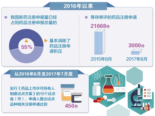 “《关于深化审评审批制度改革鼓励药品医疗器械创新的意见》的出台,不仅吹响了我国医药创新的号角,也迎来了医药创新的黄金时代。”国家食药监总局南方医药经济研究所副所长陶剑虹告诉《经济日报》记者,2016年以来,我国新药注册申报量已经占到药品注册申报总量的55%,基本消除了药品注册申请积压,等待审评的药品注册申请已由2015年8月份的21668件降至2017年8月份的3000件。抗生素和疫苗临床试验申请、中药民族药注册申请也已实现按时限审评。