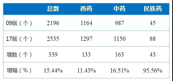 备受瞩目的2017版国家医保目录于2017年2月23日发布。按通用名分,西药和中成药部分共计2535个,较2009年版目录增加了339个,增幅约15.4%。其中西药部分1297个,中成药部分1238个(含民族药88个)。中药饮片部分未作调整,仍沿用2009年版药品目录的规定。