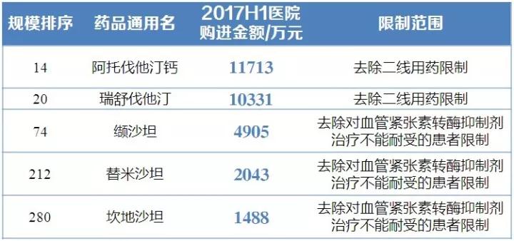 阿托伐他汀、瑞舒伐他汀和普伐他汀3个降血脂药物及抗肿瘤药物洛铂均取消了二线用药限制,上述品种限制的放开有望带来同类产品竞争力的进一步加强,市场份额快速提升。缬沙坦等品种均为解除部分使用限制,对产品市场的影响相对较小。