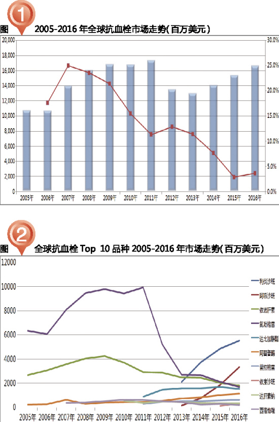 据全球畅销药物数据统计,2005-2006年全球抗血栓药物市场总额保持在100亿美元以上;2007-2011年全球抗血栓药物市场总额保持在140亿~180亿美元之间,在此期间,氯吡格雷引领市场,2011年该产品销售额接近100亿美元;2012年重磅产品专利到期之后,全球抗血栓药物市场开始下滑, 氯吡格雷渐显颓势;随着2012年达比加群酯、利伐沙班、阿哌沙班等新药上市,全球抗血栓药物市场此后又重新崛起,2015年回升至153.9亿美元,2016年市场高达166.8亿美元。