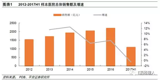 从PDB样本医院整体销售额来看,2012-2016年销售总额不断提升,由1523.91亿元增长到2188.50亿元,按照样本医院与我国等级医院销售额1:5计算,则2016年我国等级医院药品销售额为10942.5亿元。从增速上看,2014年以后增速呈不断下滑趋势,2017H1增速首次转负,为-0.58%。
