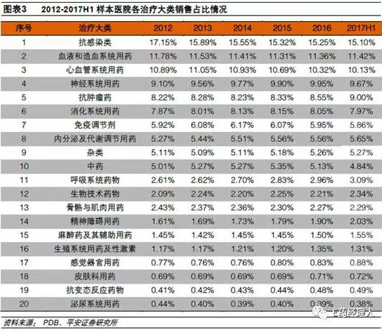 抗感染类由2012年的17.15%下降到2017H1的15.10%;
