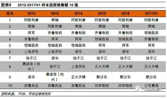 从样本医院销售企业10强看,阿斯利康和辉瑞常年占据销售额前两名地位,国内企业中恒瑞医药上升幅度较大,由2012年的第5位上升到2017H1的第3位,正大天晴和江苏豪森分别于2014和2017H1挤入10强名单。从2014年开始,前10强内外资企业个数相等,说明部分内资制药企业已经初步具备与外资巨头在国内市场分庭抗礼的实力。