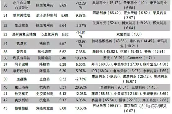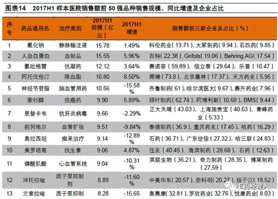 从2017H1销售额排名前50位品种所属治疗大类来看,抗感染和神经系统用药各占9个,是数量最多的大类,其次是抗肿瘤药的6个。总的来说,各治疗大类所含前50位药品数量与其占PDB药品销售总额的比例大小呈正相关关系,用药市场空间大的大类更容易产生重磅品种。