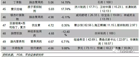 CAGR低于PDB样本医院整体的有23个品种,其中多为神经节苷脂、前列地尔、奥拉西坦、磷酸肌酸等营养剂或辅助用药。从前50大品种来看,目前我国用药市场正经历大浪淘沙的过程,过去临床效果不明显、药物经济学差及滥用品种市场份额将持续缩小。