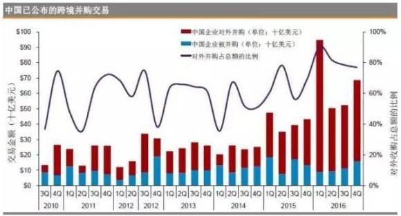 汤森路透报告显示,2016年已公布的跨境并购主要集中在金融、能源与电力、电信三个行业。从并购金额上看,医疗板块跻身top10。